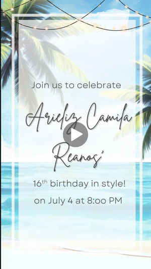 Celebrate your Sweet 16 in style with our Tropical Summer Beach Video Invite! This vibrant and fun-filled video features sun, sand, and sea, setting the perfect tropical vibe for your beach-themed party.