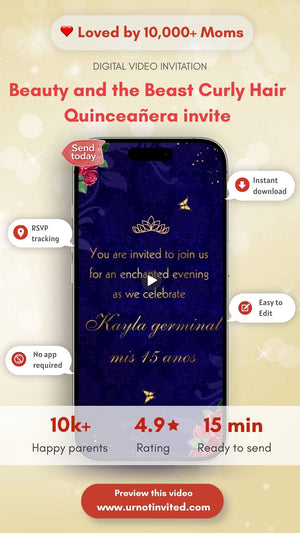 Celebrate her magical milestone with our Beauty and the Beast Quinceañera Brown Princess & Curly Hair Invitation — a stunning blend of golden elegance, enchanted roses, and fairytale charm.This beautiful digital invite celebrates princess beauty with graceful curly hair and royal vibes. Perfect for a glamorous Beauty and the Beast–themed quinceañera celebration.