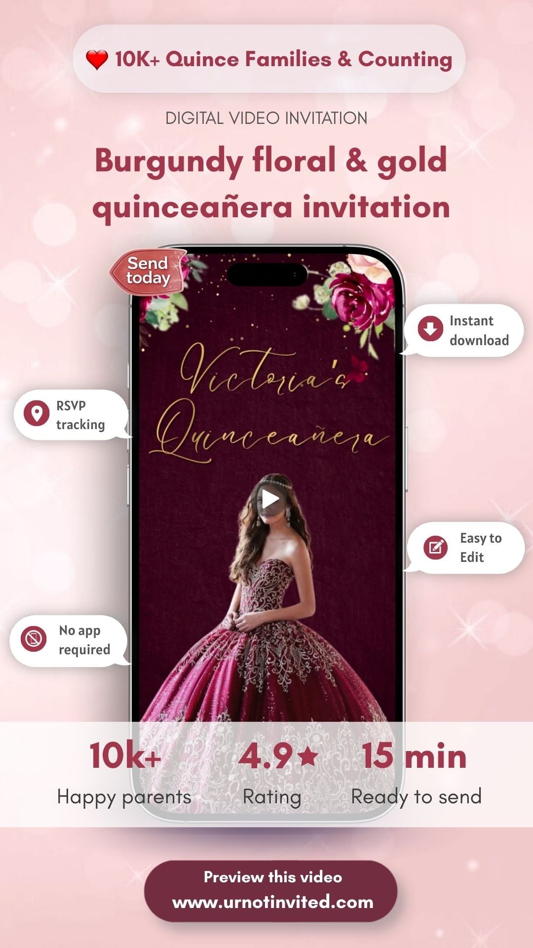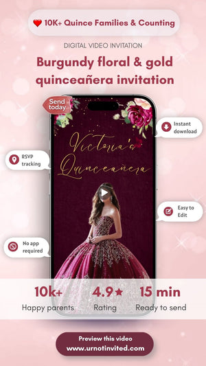 Celebrate her special milestone with our Burgundy Floral & Gold Quinceañera Video Invitation — a luxurious blend of deep burgundy blooms, shimmering gold accents, and elegant feminine charm. This digital invite is perfect for a glamorous and sophisticated quinceañera celebration filled with romance and grace. Designed to feel classy, regal, and unforgettable, it sets the tone for a truly magical 15th birthday event.