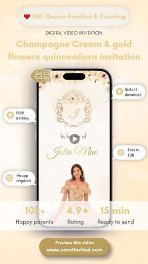 Celebrate in royal style with this Champagne Cream Gold Flowers Quinceañera. Designed with dreamy champagne tones, sparkling crystal accents, magical textures, elegant typography, and enchanting animations — this digital invite is perfect for anyone who loves royal elegance, and a truly unforgettable celebration.