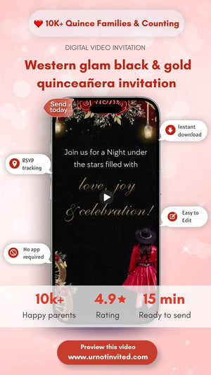 This Black, Red and Gold Cowgirl Quinceañera animated video invitation isinstantly editable — no design skills or software needed. Perfect forweddings, birthdays, showers, graduations, and more.