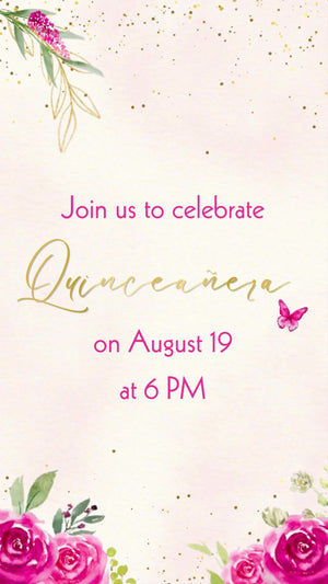 Celebrate her unforgettable milestone with our Hot Pink Floral Quinceañera Video Invitation — a vibrant blend of bold pink blooms, elegant floral details, and glamorous feminine charm. This eye-catching digital invite is perfect for a stylish and luxurious quinceañera celebration filled with sparkle and confidence. Designed to feel classy, modern, and magical, it sets the tone for a fabulous 15th birthday event.