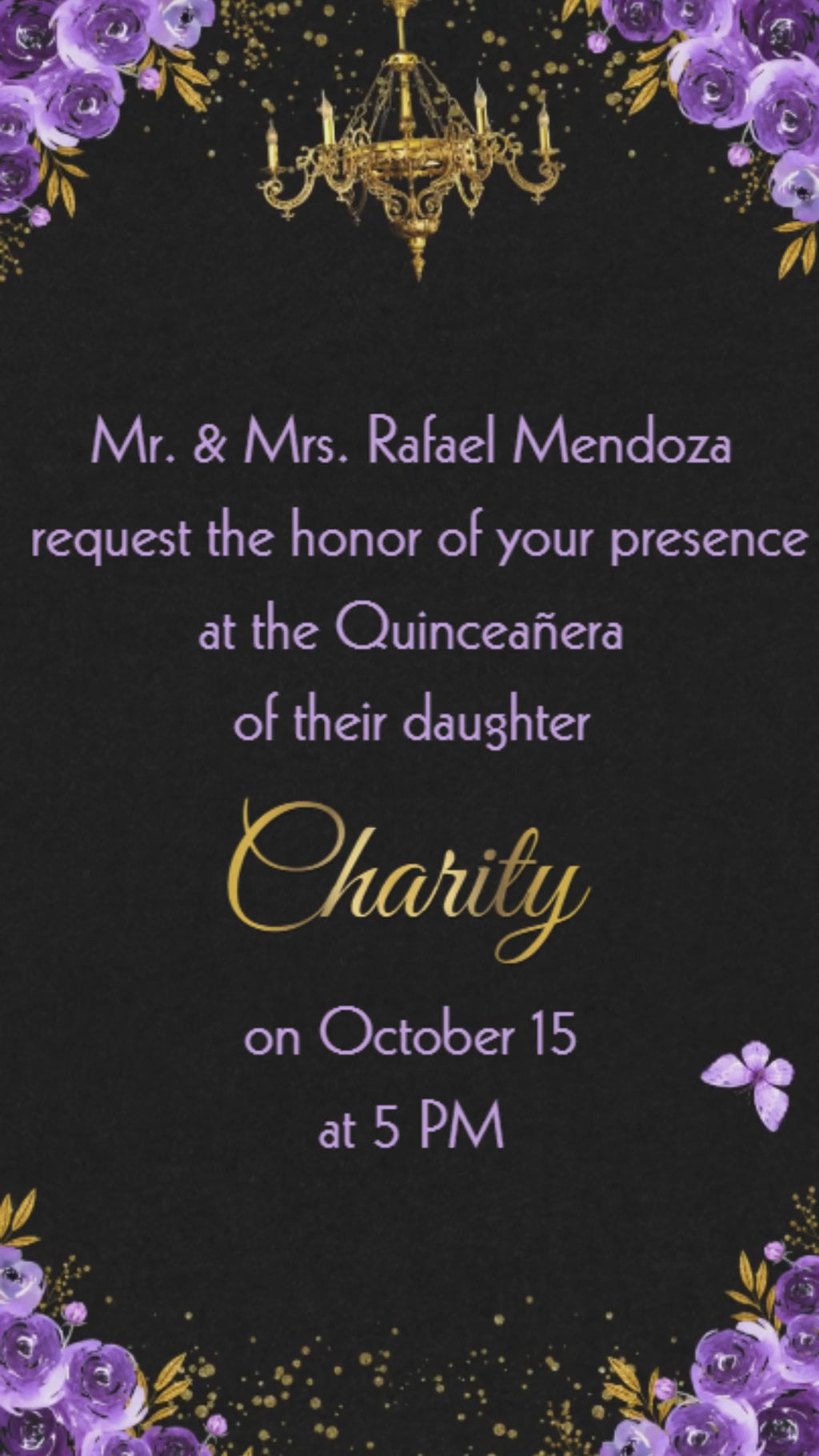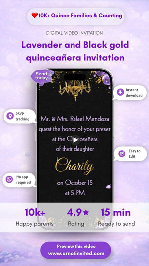 Our Lavender & Black gold Quinceañera Video Invitation features soft pastel purples, clean black accents, with gold highlights delicate florals, and a dreamy princess vibe - perfect for a sweet and memorable 5th birthday celebration.
