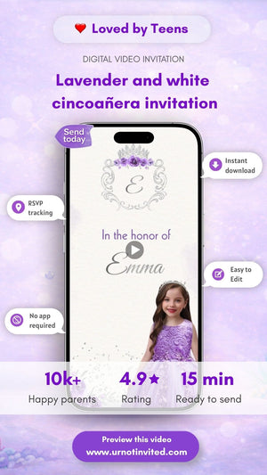 Our Lavender & White Cincoañera Video Invitation features soft pastel purples, clean white accents, delicate florals, and a dreamy princess vibe - perfect for a sweet and memorable 5th birthday celebration.