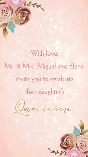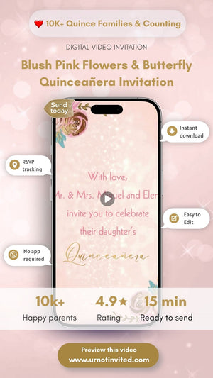 Celebrate her milestone with our Blush Pink Flowers & Butterfly Quinceañera Video Invitation — a beautiful blend of soft blush florals and delicate butterfly charm.
