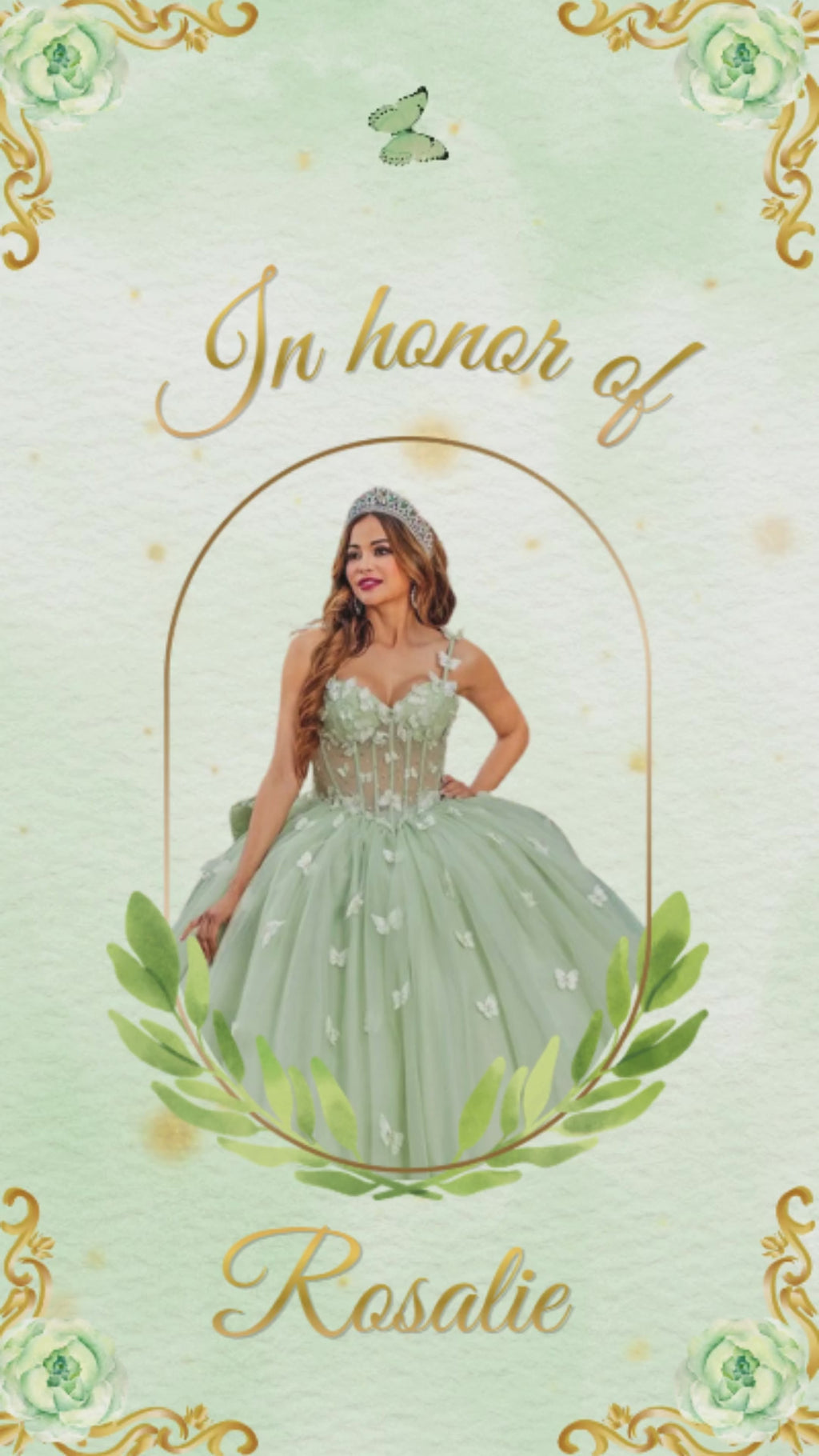 This elegant animated invite features soft mint green tones, luxurious gold accents, and enchanting fairy-tale charm, creating the perfect atmosphere for a glamorous and unforgettable Sweet 16 celebration.