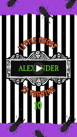 This bold design features eerie black-and-white stripes, spooky green accents, and creepy-cool Beetlejuice vibes — the perfect choice for a hauntingly fun birthday party or Halloween bash