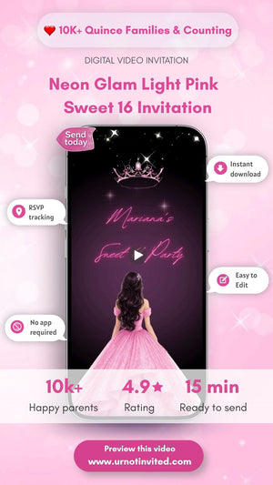Celebrate her milestone with our Light Pink Neon Glam Quinceañera Video Invitation — a trendy blend of soft pink tones and glowing neon accents. This stylish digital invite captures a modern and glamorous party vibe. Perfect for a bold, chic, and unforgettable quinceañera celebration.