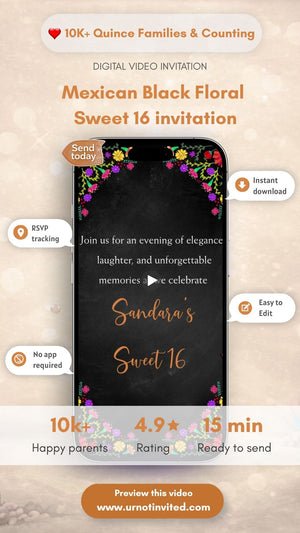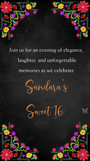 Celebrate her milestone with our Mexican Fiesta Floral Black Sweet 16 Invitation — a bold blend of vibrant florals on a chic black backdrop. This stylish digital invite captures festive charm with a modern twist. Perfect for a colorful, lively, and glamorous Sweet 16 celebration.
