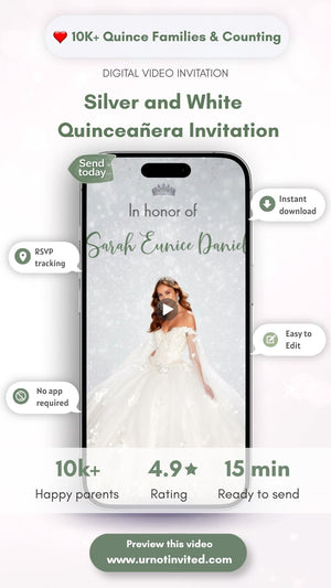 Celebrate a beautiful milestone with our Silver and White Quinceañera digital video invitation. Designed with elegant silver accents and a graceful white theme, this invite reflects sophistication, charm, and timeless beauty. The luxurious color palette creates a refined and memorable first impression, perfectly setting the tone for a magical quinceañera celebration filled with joy, love, and unforgettable moments