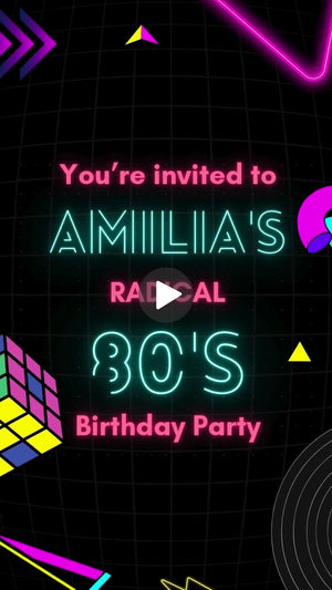 This 80’s Neon Radical Birthday Video Invitation brings all the retro vibes: neon grids, bold patterns, glowing typography, cassette tapes, arcade lights, and that iconic electric 80s energy. Perfect for anyone who loves nostalgia, bright colors, and a dance-filled celebration.