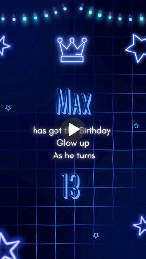 Light up the night with this electrifying Neon Glow Boy Birthday Video Invitation! Designed with glowing neon colors, bold typography, UV party elements and dynamic animations, this invite is perfect for boys who love high-energy celebrations, dance parties, DJ themes and futuristic style.