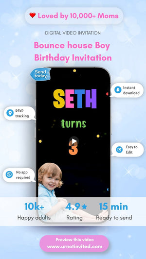 Jump into the fun with our Bounce House Boy Birthday Invite — a playful blend of bright colors, inflatable fun, and high-energy vibes. This lively digital invite captures the excitement of a bouncy celebration. Perfect for a fun-filled, active birthday party. Set the tone for a joyful and unforgettable day.