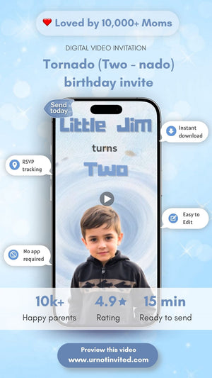 ¡Se acerca una tormenta de diversión! ¡Invita a tus familiares y amigos cercanos con esta invitación digital a la fiesta de cumpleaños de Two-nado! 🌪🌪🌪