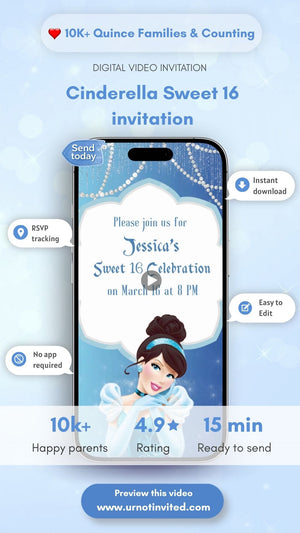 Make her Sweet 16 unforgettable with our Cinderella Sweet 16 Invitation — a breathtaking blend of icy blue elegance, sparkling glass slipper details, and royal fairytale charm. Inspired by a timeless princess story, this digital invite captures grace, beauty, and magical midnight moments. Perfect for a glamorous, princess-themed celebration that feels classy, enchanting, and straight out of a fairytale.