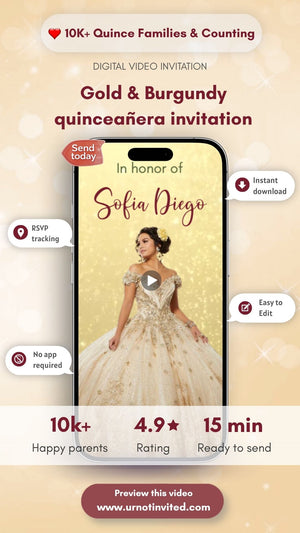 El tema exquisito y llamativo del deslumbrante dorado y burdeos hará que tu fiesta de quinceañera sea inolvidable. Puede informar rápidamente a sus invitados sobre todos los detalles de su día especial con nuestra invitación digital. Por lo tanto, conviértalo en un evento memorable con esta impresionante Invitación de Quinceañera en Oro y Borgoña.