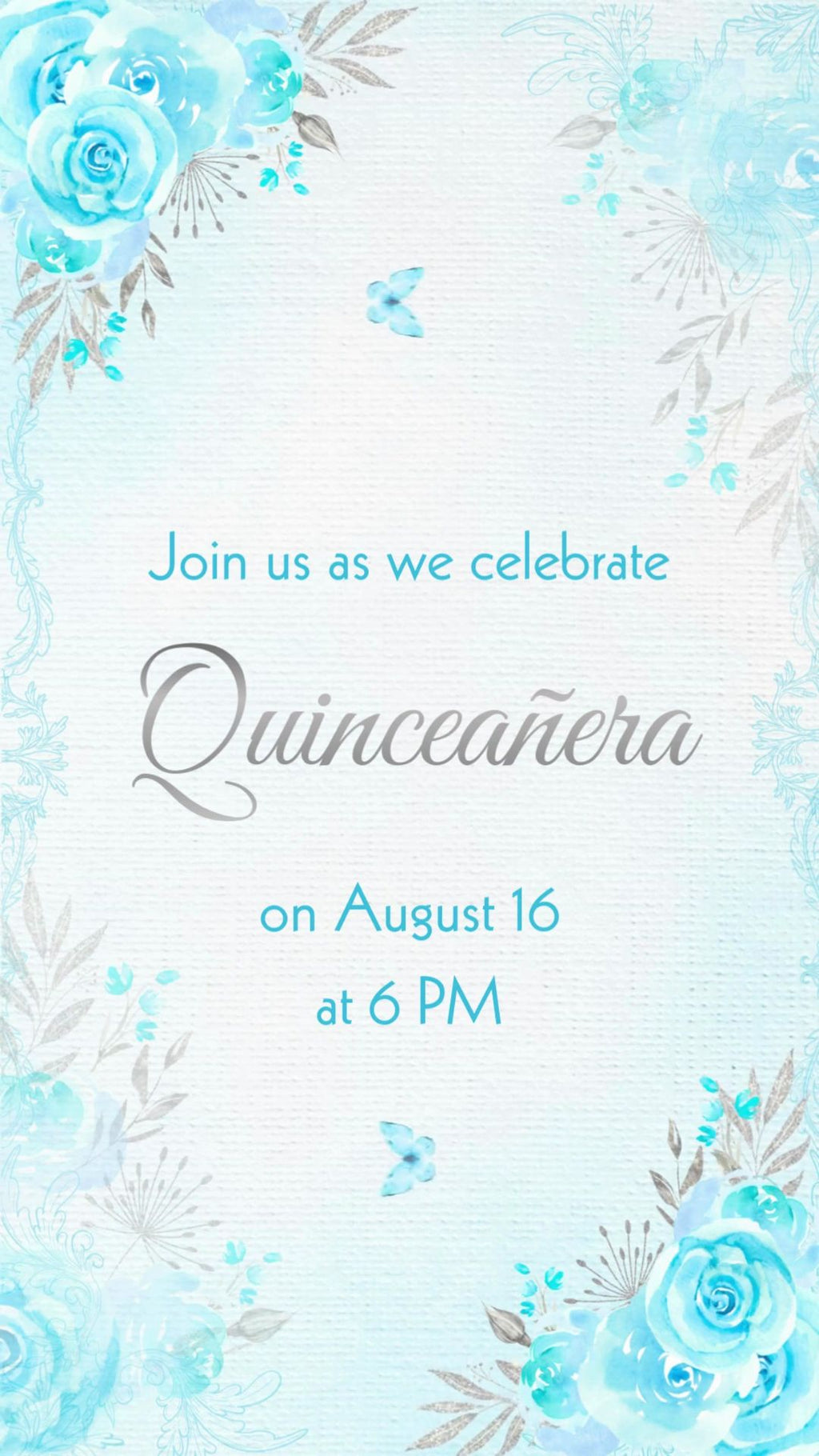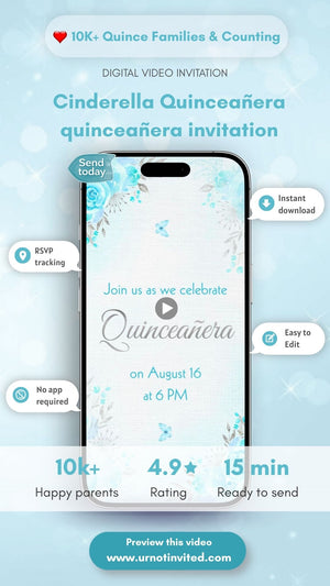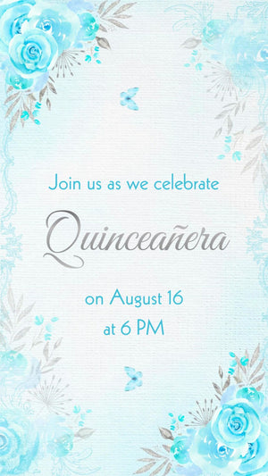 Celebrate her fairytale milestone with our Cinderella Blooming Quinceañera Video Invitation — a dreamy blend of soft blue elegance and blooming floral charm.