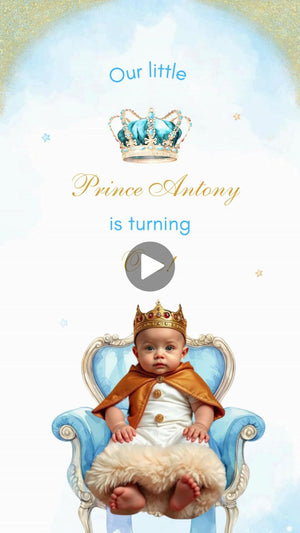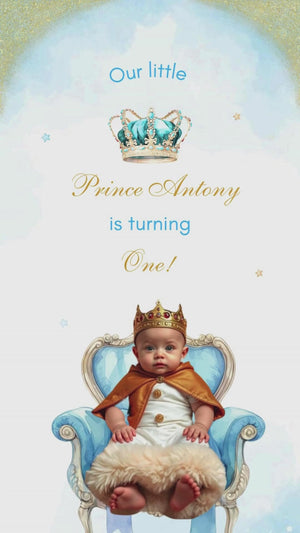 This elegant design features soft blue and gold tones, crown accents, and storybook royal charm — an ideal choice for a prince-themed birthday, regal baby shower, or magical milestone.