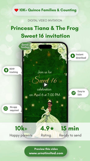 Make her Sweet 16 unforgettable with our Princess Tiana and the Frog Sweet 16 Video Invitation — a magical blend of emerald green elegance, golden royal accents, enchanting lily pads, and fairytale charm. Inspired by a beloved princess story, this digital invite captures the beauty of dreams, determination, and royal grace. Perfect for a glamorous, New Orleans–inspired celebration that feels classy, magical, and full of happily-ever-after vibes.